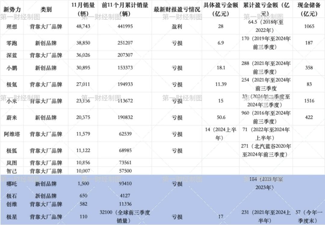 再看看国内新势力品牌在2024年前11个月销量排名。(其中理想背靠大厂品牌的说法并不准确)