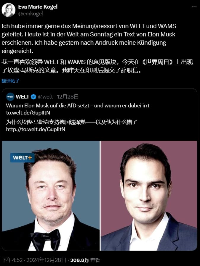 据《明镜周刊》报道,多夫纳在圣诞节前邀请马斯克撰写那条社交媒体帖子,并促成了专栏文章。