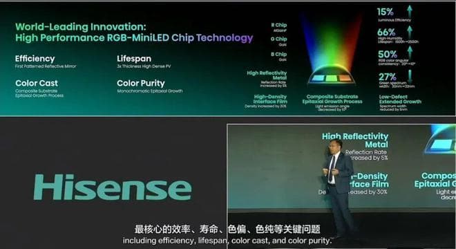 CES开幕前,海信发布自主研发的RGB三维控色液晶显示技术,基于新一代信芯AI画质芯片和RGB-MiniLED芯片,突破单一控光到“光色同控”的行业难题,完成黑白背光到RGB多基色背光的质变,使得色域面积、能效较传统Mini LED电视提升20%左右。