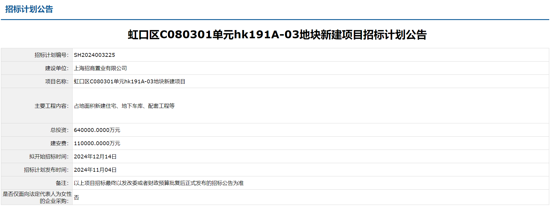 对于虹口四川北路地块,招商蛇口极为重视。上海市建设市场信息服务平台显示,早在11月4日,招商蛇口旗下上海招商置业有限公司便已发布虹口区C080301单元hk191A-03地块新建项目招标计划公告,计划总投资64亿,建安费11亿。