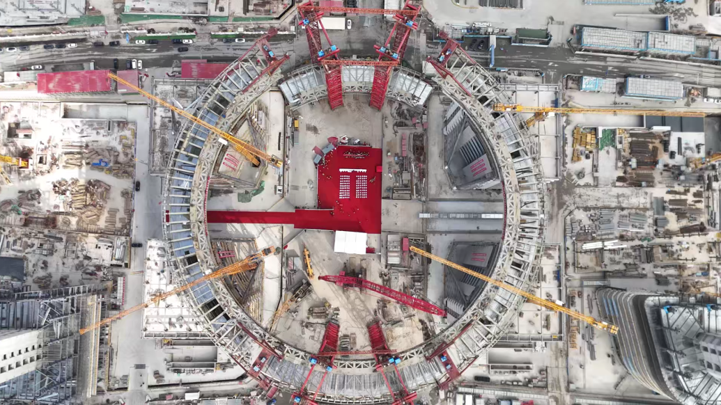 项目由上海机械施工集团有限公司(下称“上海机施”)实施。据上海机施介绍,“荣耀之环”环顶高度56.15米,圆环结构高度为6.6米,宽度14米,单跨跨度为120米,钢结构工程总重量1万余吨。