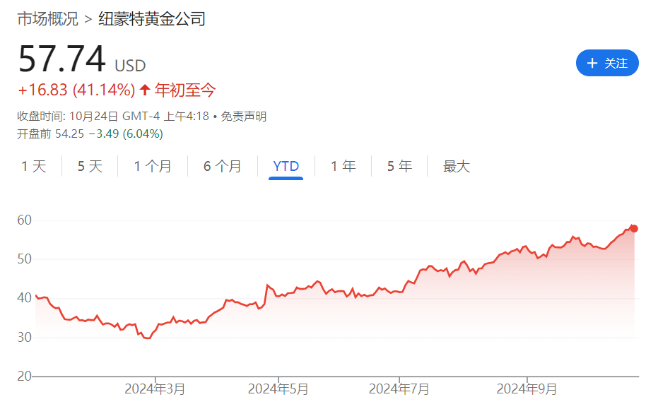 今年以来,纽蒙特矿业的股价累计上涨逾40%,明显优于同期标普500指数22%的涨幅。