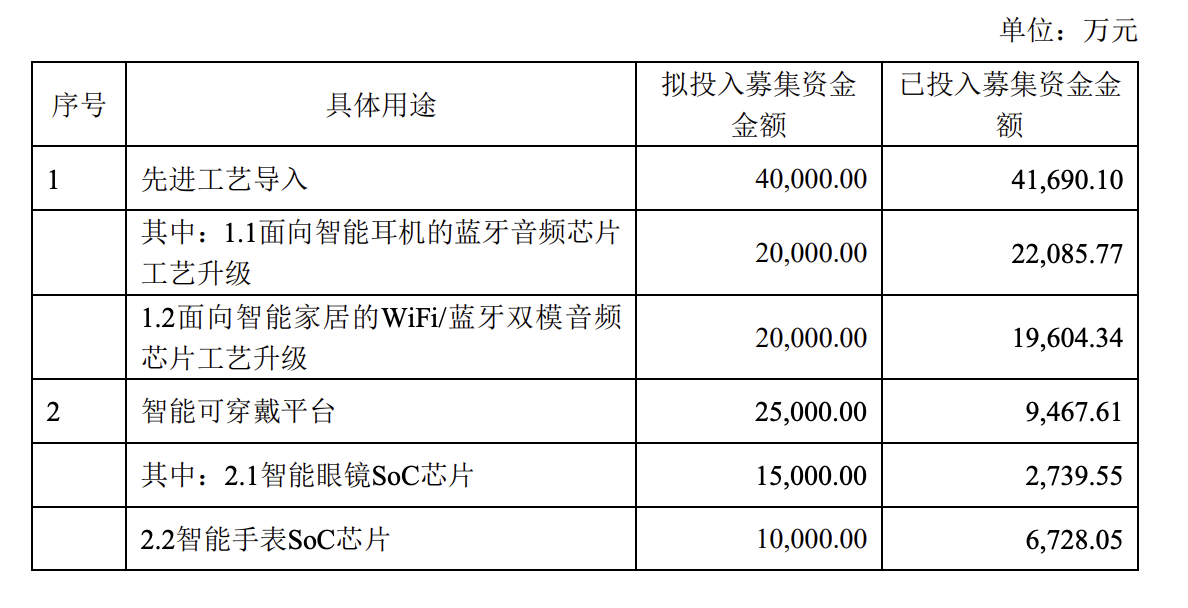 其中,计划使用超募资金人民币4.3亿元,用于增加募投项目“发展与科技储备项目”的投资金额。具体来看,将主要投入“面向智能耳机的蓝牙音频芯片工艺升级”子项目、“面向智能家居的WiFi/蓝牙双模音频芯片工艺升级”子项目、“智能手表SoC芯片”子项目。