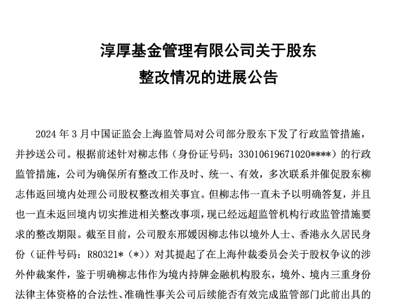 淳厚基金最新公告喊话“催促股东柳志伟返境”,整改仍在进行中