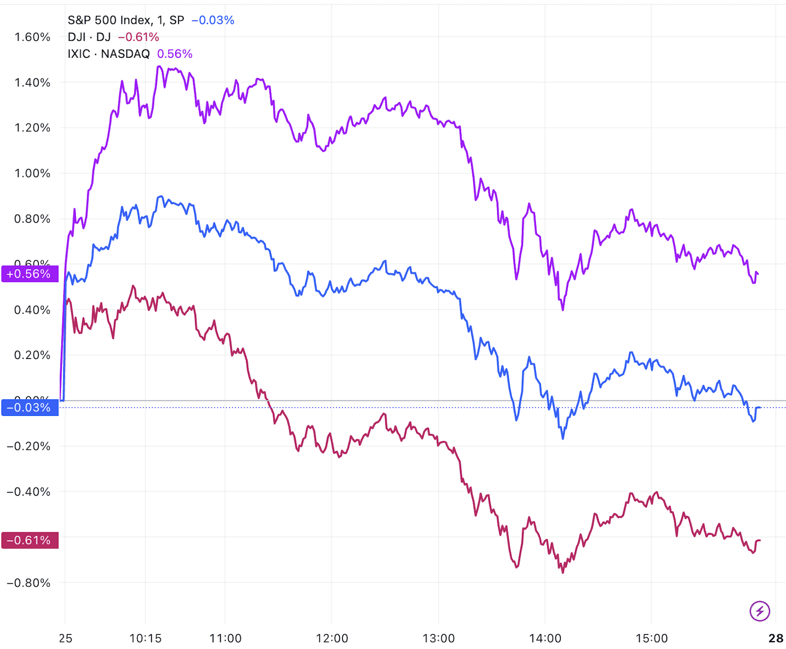 截至收盘,道琼斯指数跌0.61%,报42,114.40点;标普500指数跌0.03%,报5,808.12点;纳斯达克指数涨0.56%,报18,518.61点。