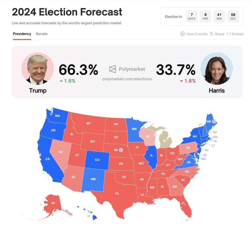 据媒体报道,在时下最主流的加密预测平台Polymarket上,特朗普赢得2024年美国大选的概率周一已达到了66.3%。