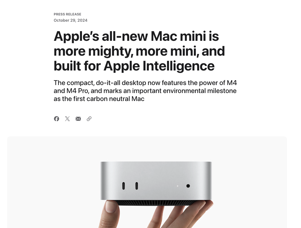 财联社10月30日讯(编辑 史正丞)当地时间周二,苹果再次通过新闻稿发布新品——这回是传闻已久的新款Mac mini和M4 Pro芯片。