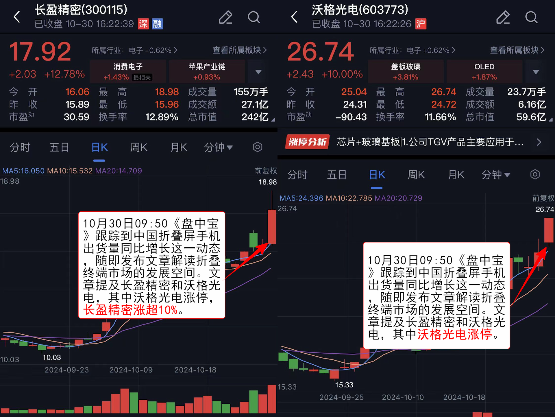 ,随即发布文章解读折叠终端市场的发展空间。文章提及长盈精密和沃格光电,其中沃格光电涨停,长盈精密涨超10%。