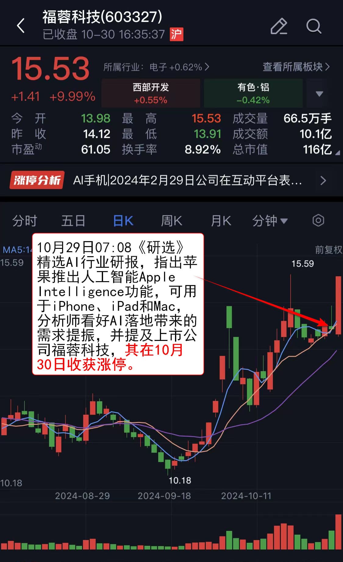 ,指出苹果推出人工智能Apple Intelligence功能,可用于iPhone、iPad和Mac,分析师看好AI落地带来的需求提振,并提及上市公司福蓉科技,其在10月30日收获涨停。