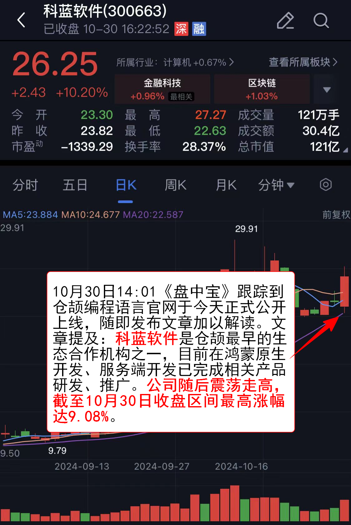 ,随即发布文章加以解读。文章提及:科蓝软件是仓颉最早的生态合作机构之一,目前在鸿蒙原生开发、服务端开发已完成相关产品研发、推广。公司随后震荡走高,截至10月30日收盘区间最高涨幅达9.08%。