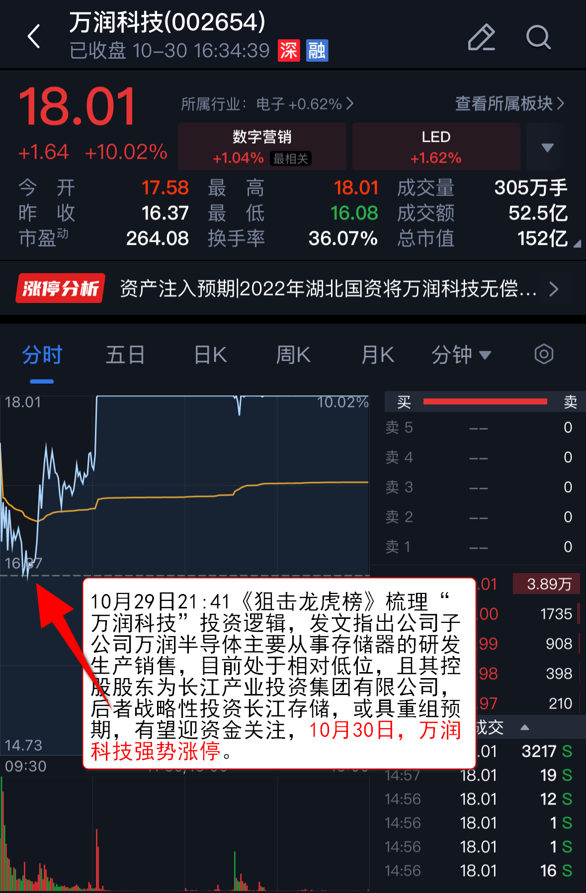 ,发文指出公司子公司万润半导体主要从事存储器的研发生产销售,目前处于相对低位,且其控股股东为长江产业投资集团有限公司,后者战略性投资长江存储,或具重组预期,有望迎资金关注,10月30日,万润科技强势涨停。
