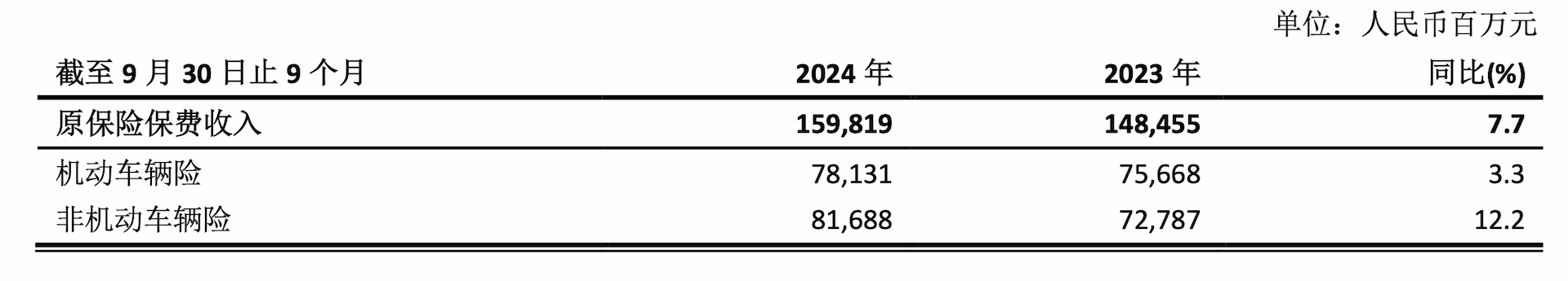 其中,车险原保费收入781.31亿元,同比增长3.3%;非车险原保费收入816.88亿元,同比增长12.2%。2024年前三季度核心指标中,承保综合成本率为98.7%,与去年同期持平。