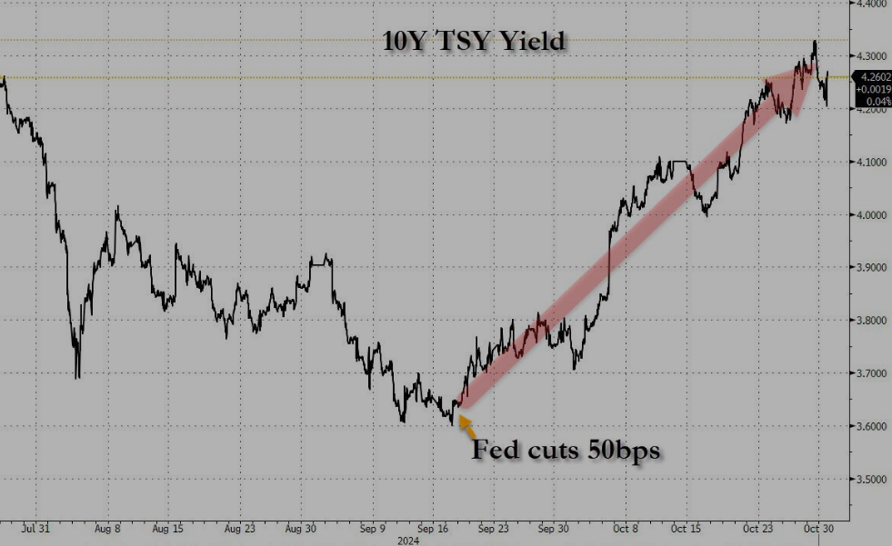 如下图所示,自9月中旬美联储大幅降息50个基点以来,10年期美债收益率反而累计大幅上涨了逾55个基点。那些在购房前一直等待美联储降息的美国人,正再度绝望般地面临着“7字头”的抵押贷款利率——因为美国抵押贷款的定价往往会更为贴合于收益率曲线的长端变化。