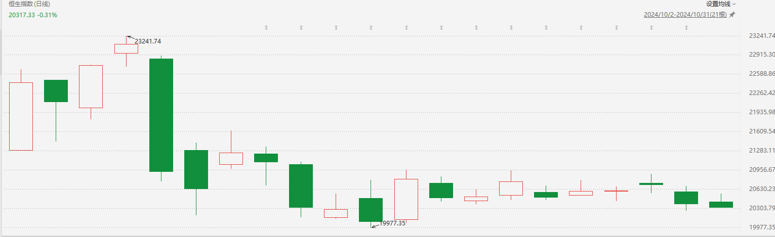 具体来看,在本月初,港股开门红,恒生指数涨幅达到6%,站上22400点。随后在10月8日出现持续调整。目前仍维持在20000点上方。