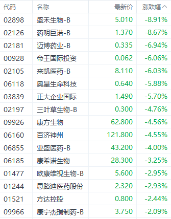 医药股中,药明巨诺-B(02126.HK)、康方生物(09926.HK)、百济神州(06160.HK)分别下跌8.67%、4.56%、4.55%。