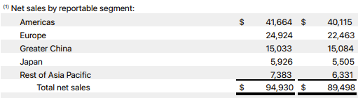 财报数据显示,苹果在该季度的营收达到949.3亿美元,同比增长6%;调整后每股收益为1.64美元,分别强于市场预期的945.8亿美元和1.60美元。