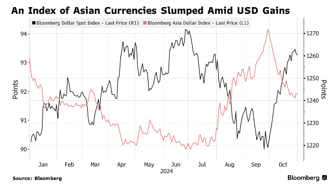 而这也直接导致了彭博亚洲货币指数在当月大跌,录得了2023年2月以来最差的月度表现。不少亚洲新兴货币因此明显承压:印度卢比接近了历史水平,韩元也逼近了三个月低位。一些策略师们已预计,亚洲货币跌势可能还将延续,尤其是如果特朗普再度上台并重燃贸易战的话。