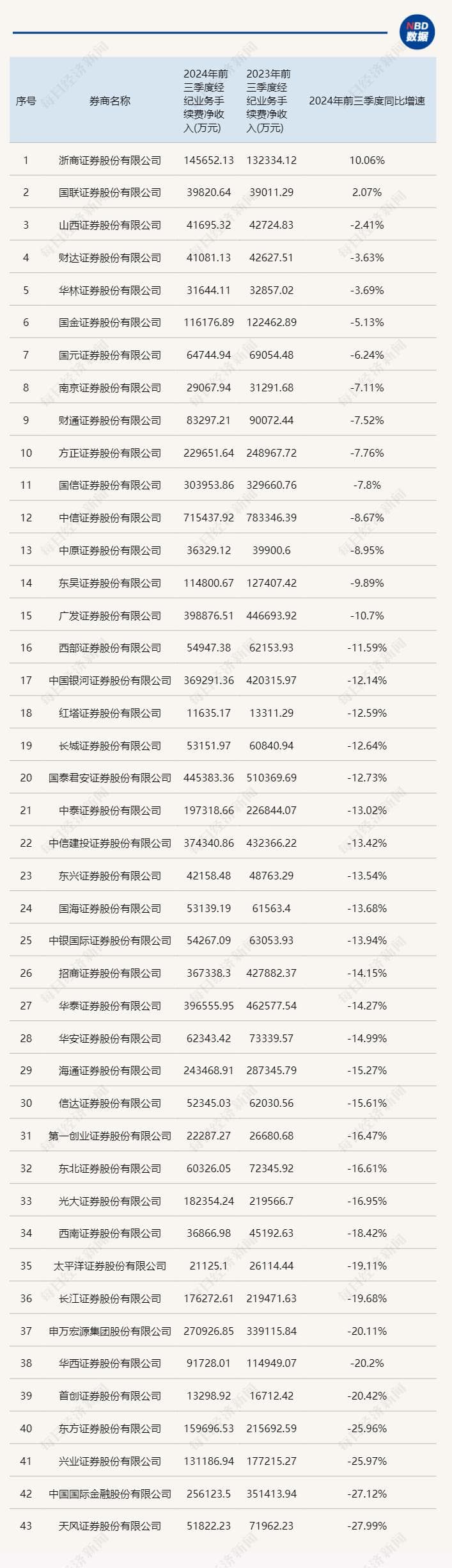 此外,今年第三季度,43家上市券商中有42家券商经纪业务手续费净收入同比下滑,且同比降幅超过20%的券商多达15家,而仅有1家券商的经纪业务实现了增长。