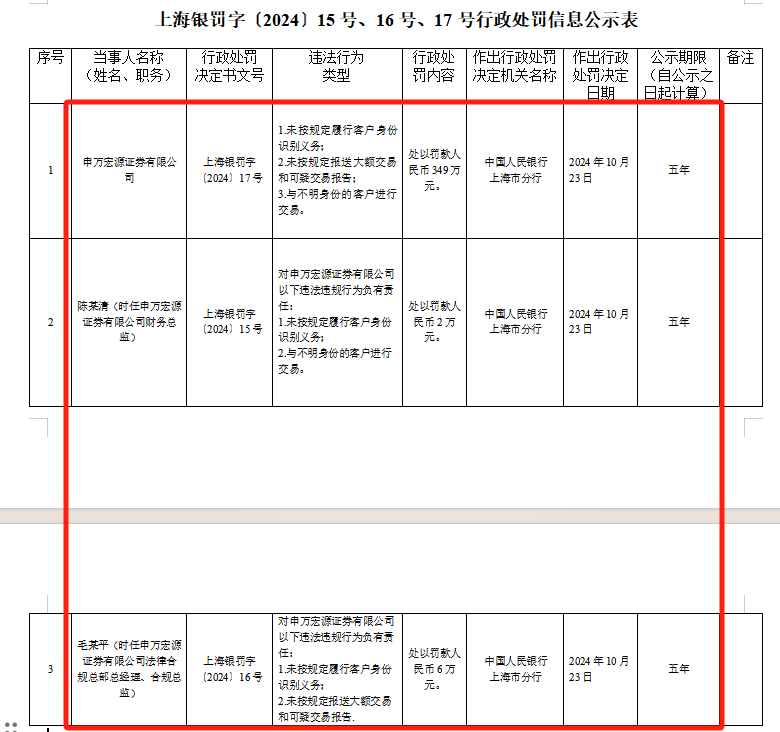 申万宏源证券被处以罚款349万元,时任申万宏源证券财务总监,法律合规总部总经理、合规总监分别被处以罚款2万元、6万元;