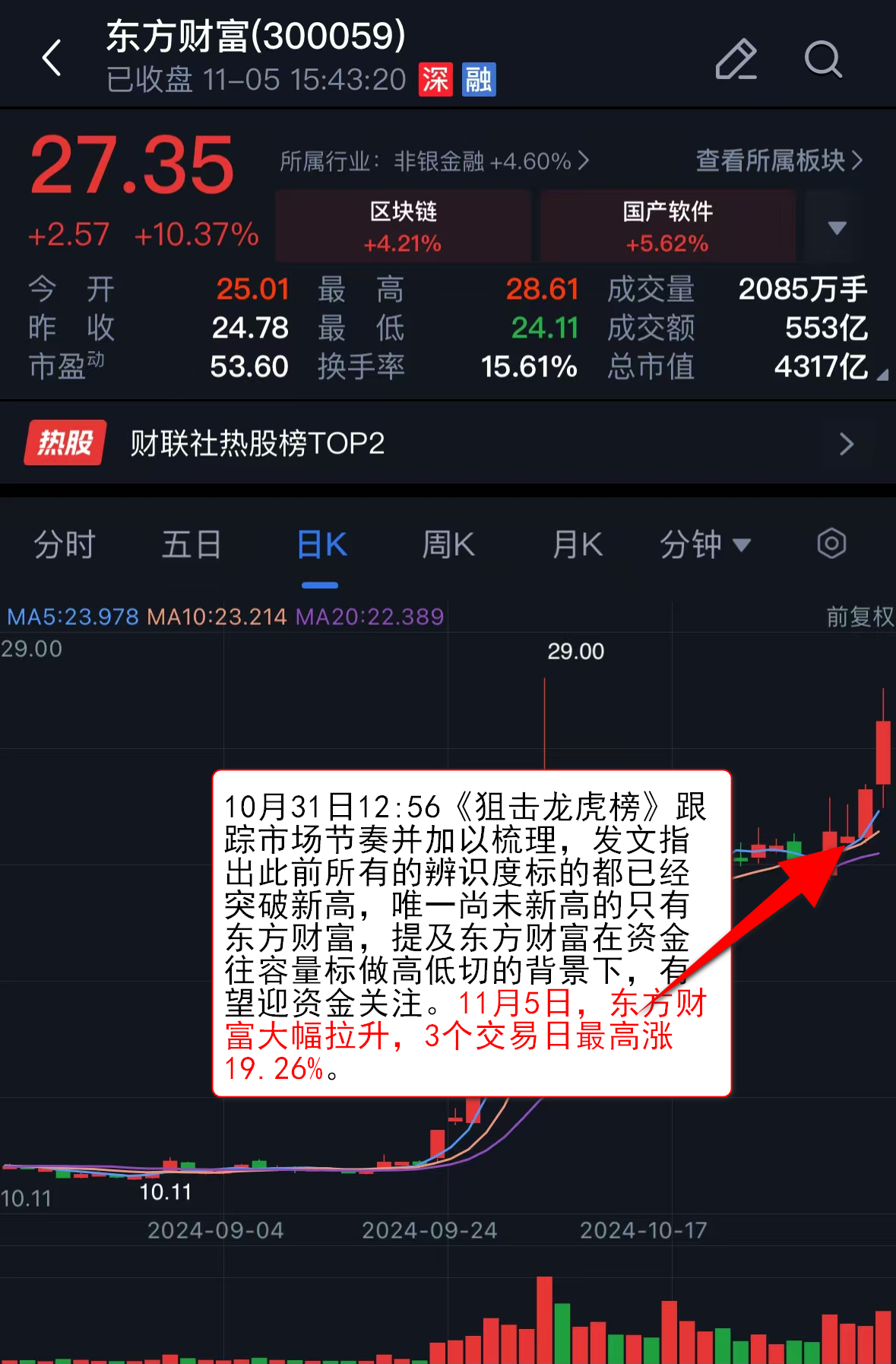 ,发文指出此前所有的辨识度标的都已经突破新高,唯一尚未新高的只有东方财富,提及东方财富在资金往容量标做高低切的背景下,有望迎资金关注。11月5日,东方财富大幅拉升,3个交易日最高涨19.26%。