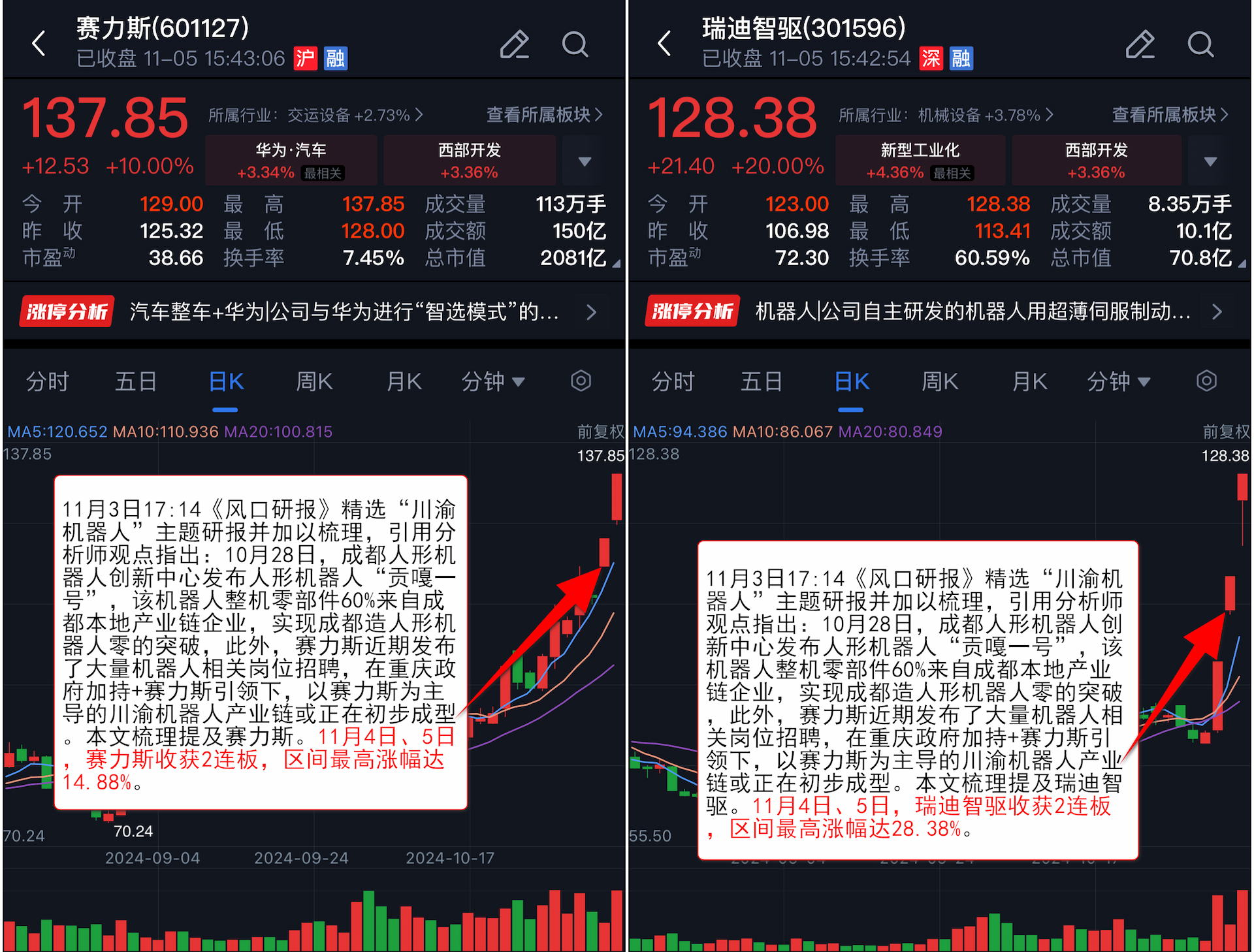 ,引用分析师观点指出:10月28日,成都人形机器人创新中心发布人形机器人“贡嘎一号”,该机器人整机零部件60%来自成都本地产业链企业,实现成都造人形机器人零的突破,此外,赛力斯近期发布了大量机器人相关岗位招聘,在重庆政府加持+赛力斯引领下,以赛力斯为主导的川渝机器人产业链或正在初步成型。本文梳理提及赛力斯、瑞迪智驱。11月4日、5日,赛力斯、瑞迪智驱收获2连板,区间最高涨幅分别达14.88%、28.38%。