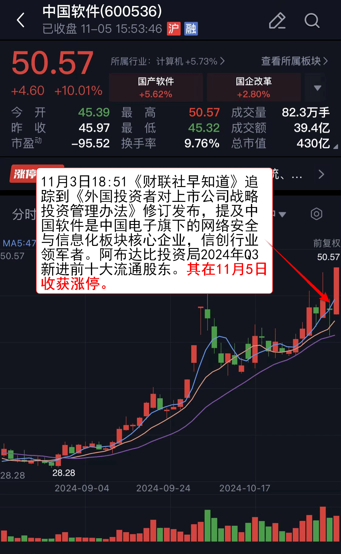 ,提及中国软件是中国电子旗下的网络安全与信息化板块核心企业,信创行业领军者。阿布达比投资局2024年Q3新进前十大流通股东。其在11月5日收获涨停。