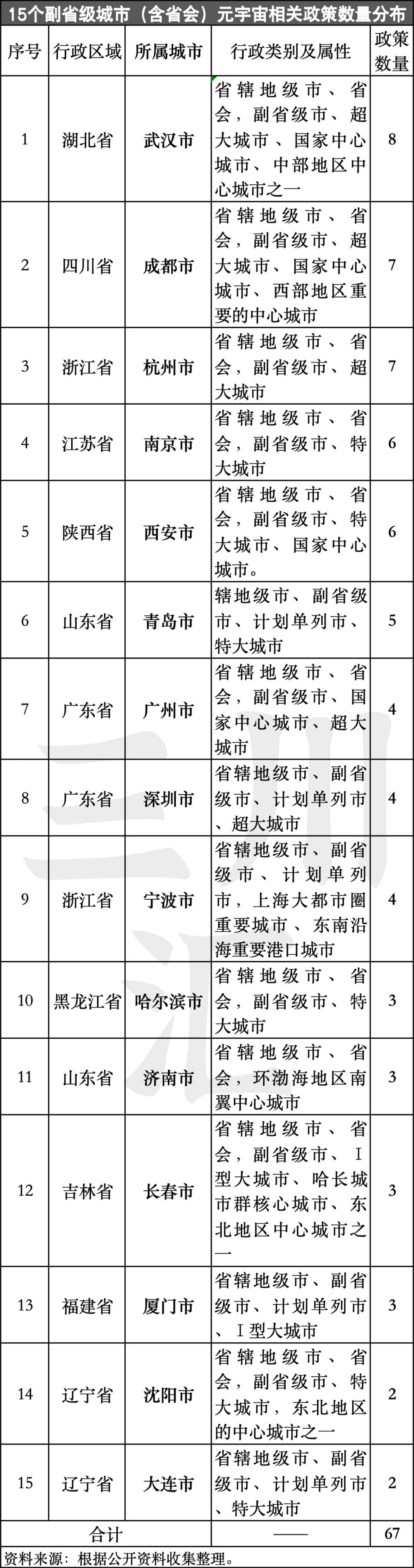(三)从副省级城市维度分析。 根据阶段性统计数据,全国15个副省级城市(含10个省会)共出台相关政策67项,占总数(120项)的55.83%。 从政策数量分布上看,武汉市、成都市、杭州市、南京市和西安市等副省级城市政策数量仍然位居前列。 此外,青岛市、深圳市、宁波市等计划单列市及广州也均出台了4项或以上的元宇宙相关政策,显示出这些副省级城市在元宇宙领域的较高的潜力和竞争力。