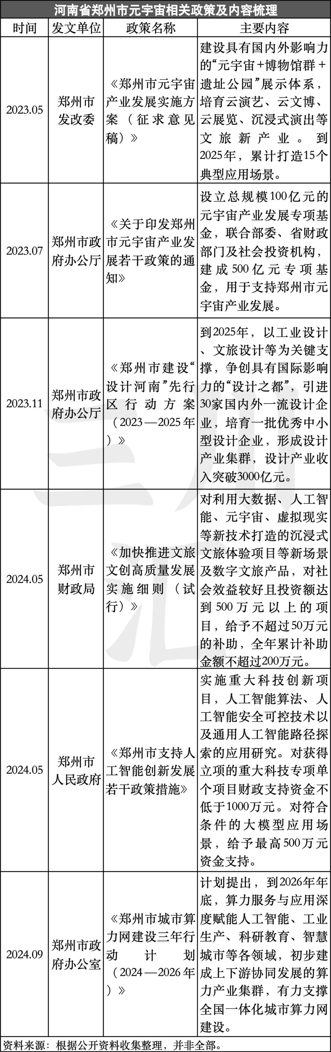 郑州市在《关于印发郑州市元宇宙产业发展若干政策的通知》中,指出将 设立总规模100亿元的元宇宙产业发展专项基金, 并联合部委、省财政部门及社会投资机构,建成500亿元专项基金,用于支持郑州市元宇宙产业发展。此外,郑州市还对利用元宇宙等新技术打造的沉浸式文旅体验项目等新场景及数字文旅产品给予了相应的资金补助政策。