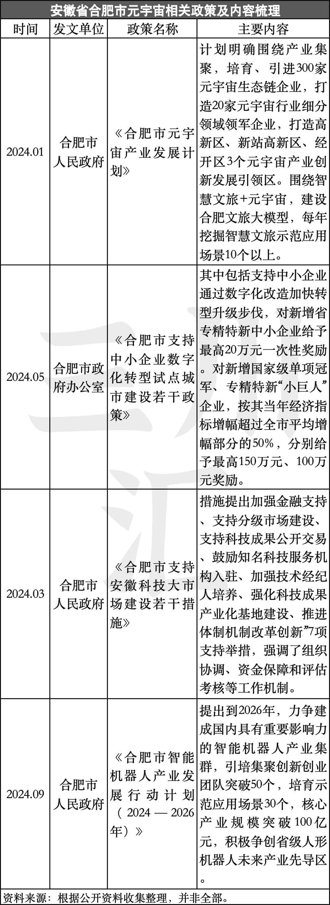 合肥市同样在《合肥市元宇宙产业发展计划》中明确,计划培育、引进300家元宇宙生态链企业,打造20家元宇宙行业细分领域领军企业, 并围绕智慧文旅+元宇宙建设合肥文旅大模型,打造智慧文旅示范应用场景10个以上; 在《合肥市支持中小企业数字化转型试点城市建设若干政策》中提出,对新增省专精特新中小企业给予最高20万元一次性奖励。