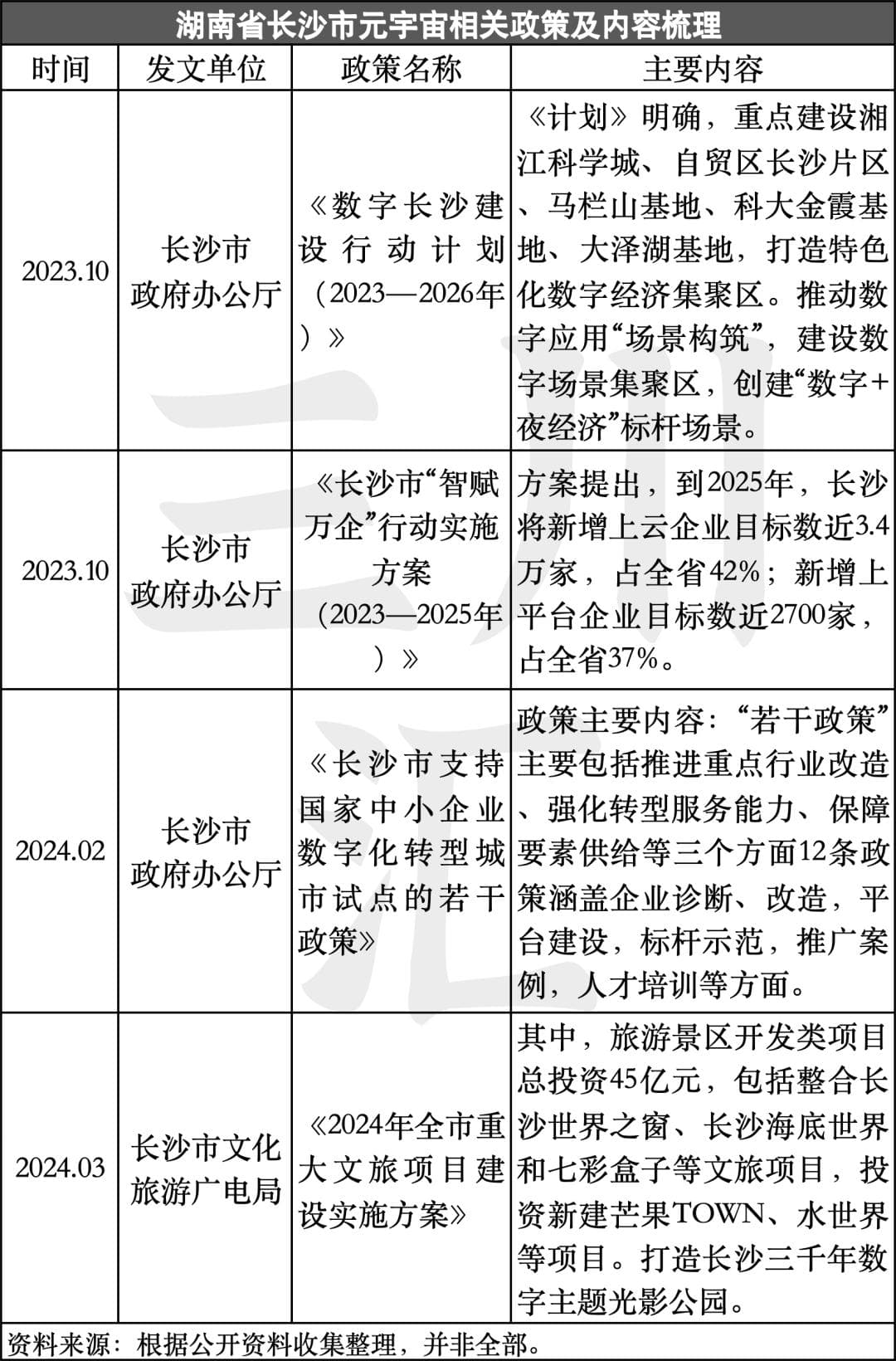 各地政策还强调数字技术在各行业的应用与创新。如长沙市在 《数字长沙建设行动计划(2023—2026年)》 中明确,重点建设湘江科学城、马栏山基地、科大金霞基地等平台,打造特色化数字经济集聚区;并在《2024年全市重大文旅项目建设实施方案》中明确,年度旅游景区开发类项目总投资45亿元,打造长沙三千年数字主题光影公园,投资新建芒果TOWN、水世界等项目。
