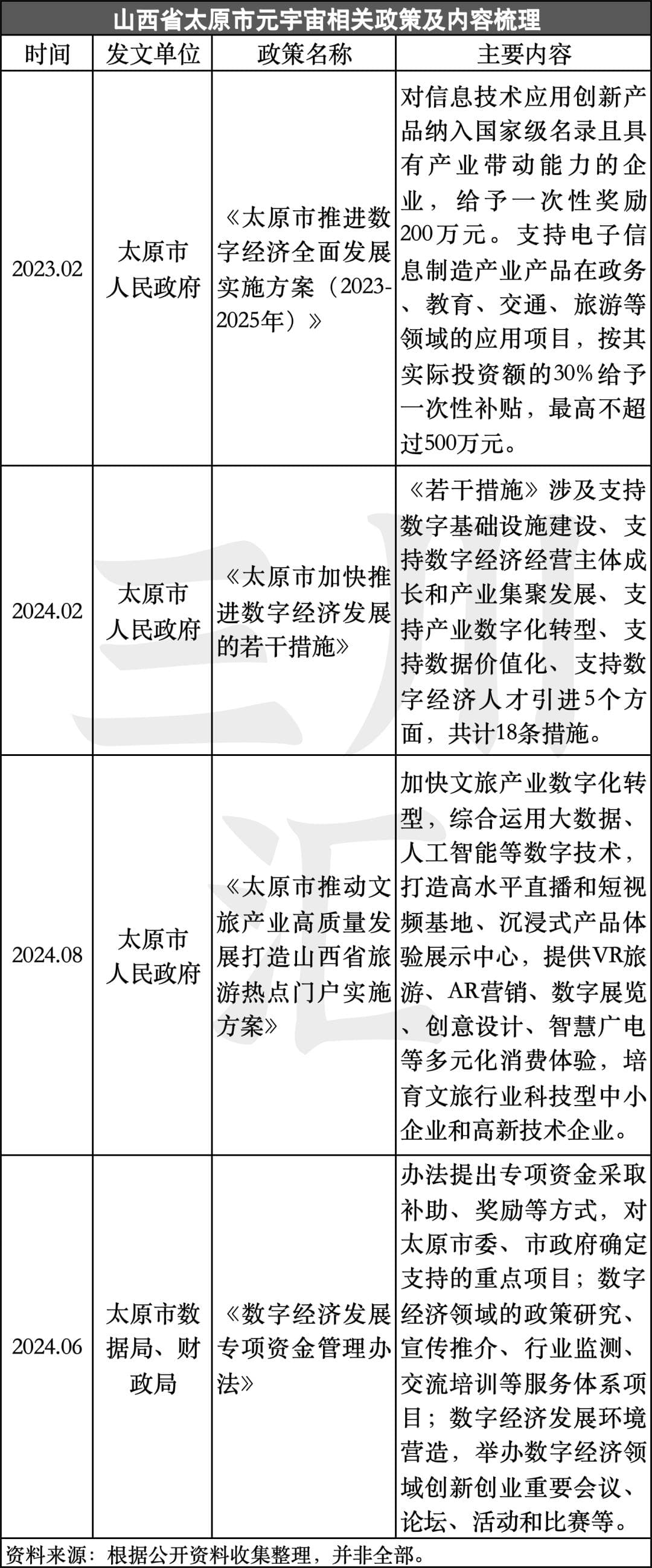 此外,太原市在 《太原市推动文旅产业高质量发展打造山西省旅游热点门户实施方案》中明确 ,综合运用大数据、人工智能等数字技术,打造高水平直播和短视频基地、沉浸式产品体验展示中心,提供VR旅游、AR营销、数字展览、创意设计等多元化消费体验,培育文旅行业科技型中小企业和高新技术企业,加快文旅产业数字化转型。