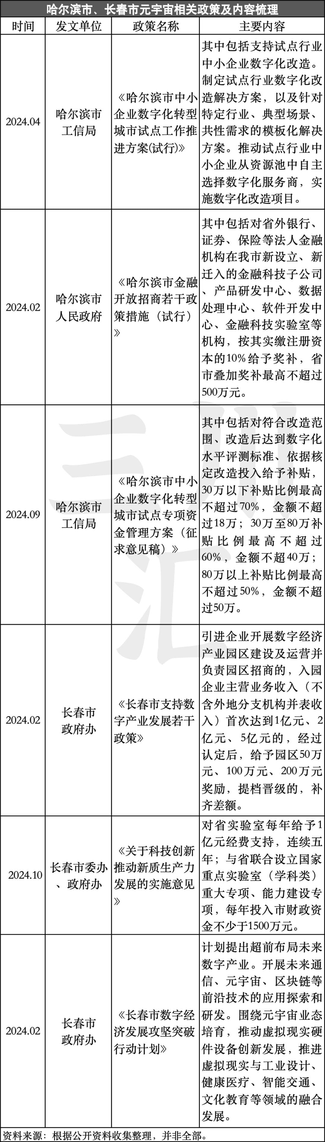 (四)东北三省强弱鲜明。 黑龙江、吉林、辽宁3省共涉及17个地级市和26项元宇宙相关政策,占总数的8.64%。其中,黑龙江省涉及7个城市、12项政策;吉林和辽宁各有4个城市和7项政策。排除行政区划等客观因素,黑龙江省各市在推进文旅领域元宇宙产业进程中表现尤为突出,从侧面反映出其地区资源和技术优势(详见下表)。