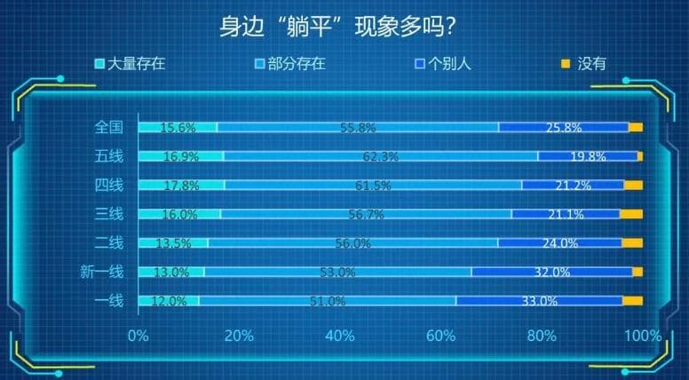 从不同城市之间的躺平比例差别中可以明显的看出来,三线以下城市”躺平“现象的比例明显高于一二线城市,最可能的原因就是一二线城市生活成本偏高。