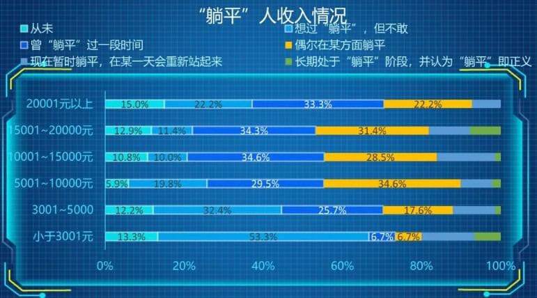 从调查数据看,选择彻底躺平退休的人大致分为两个群体:第一个是月收入3000以下的低收入群体。在调查中,选择彻底躺平的人大致占这部分群体的8%左右。而这部分群体作出这样选择的原因也不难理解:看不到更多上升空间和希望了。