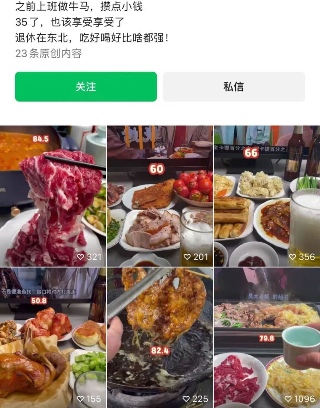 近期,关于中产提前“退休“的各类视频作品不在少数。比如“36岁女子存款300万提前退休”,“上海80后丁克夫妇存款300万提前退休”,“ 30岁硕士攒100万在云南租房躺平”等,一位视频博主在简介中直白表示:“之前上班做牛马,攒点小钱,35了,也该享受享受了”,其内容是每天低价享受东北美食。