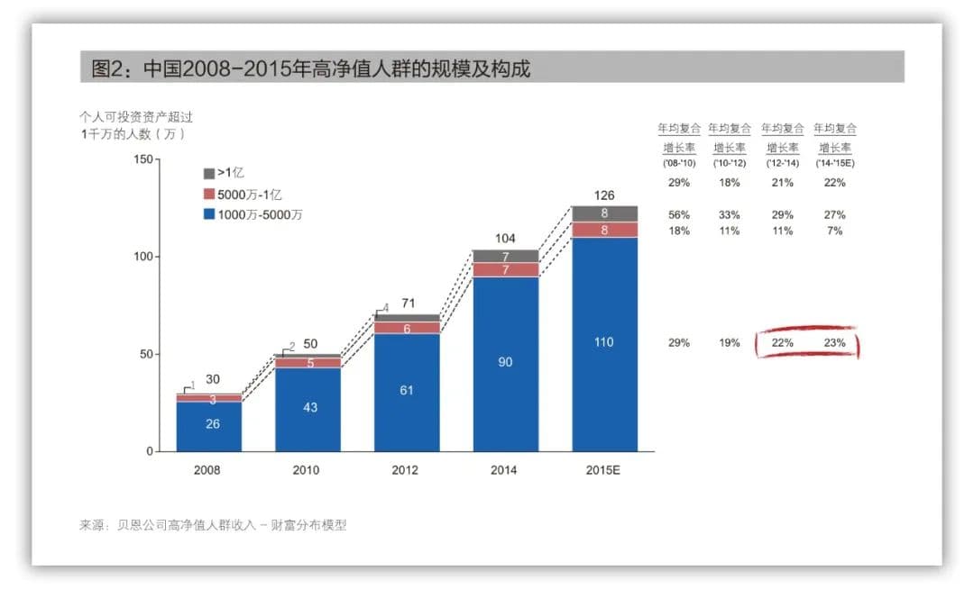 贝恩与招商银行联合发布的《2011中国私人财富报告》中提到,2010年中国的高净值人群达到了约50万人的规模,比2009年增长22%。而4年后发布的《2015中国私人财富报告》显示,中国的高净值人群数量在2014年首次超过100万人;相比2010年人群数量实现翻倍。其中,可投资资产超过1亿元人民币的超高净值人群规模近7万人,可投资资产5千万以上人士共约14万人。