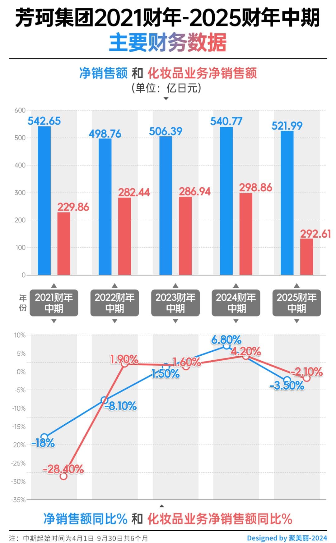 具体来看,2025财年中期,化妆品业务净销售额为292.61亿日元(约合人民币13.65亿元),同比减少2.1%;营业利润下降15.4%至34.33亿日元(约合人民币1.6亿元),主要原因是销售额下降导致毛利润减少,以及资讯期刊更新导致促销支出增加。