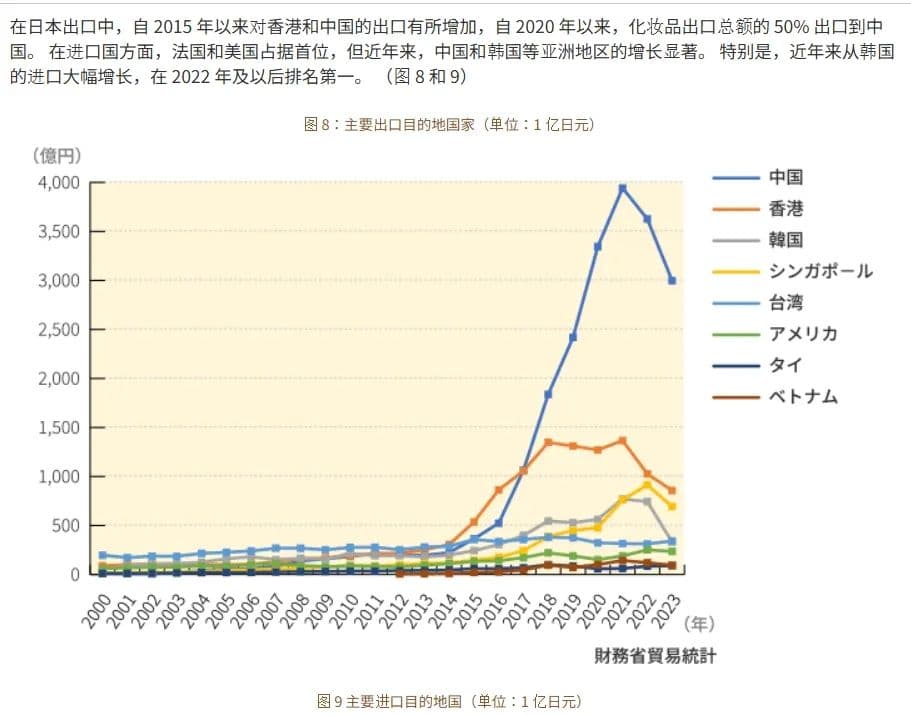 从数据来看,据中华人民共和国海关总署发布的2024年9月进出口商品主要国别(地区)总值表(人民币)显示,从日本进口的货值金额累计比去年同期下滑2.8%;日本化妆品工业会JCIA官网显示,2017年后,中国为日本化妆品出口的第一大国,且自2020年起,化妆品出口总额的50%出口到中国。但在2021年以后,日本化妆品出口中国的金额大幅下滑。