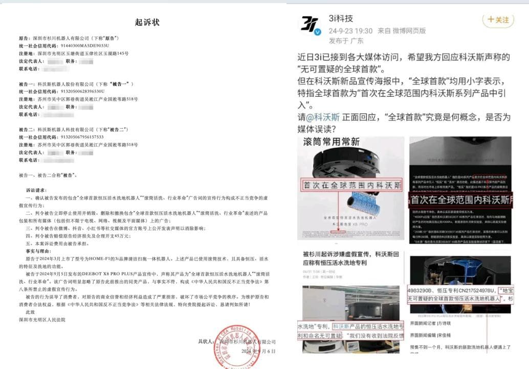 结合杉川机器人《起诉状》来看,杉川机器人旗下品牌3i科技于2022年10月推出的智能净地站H1Pro已具备活水洗地功能,即通过循环喷淋清水、刮板刮除滚筒脏水的方式保持拖布干净。2024年3月推出的智能净地站HOME-F1已使用滚筒技术,且具备的特征及洗地的功能。但科沃斯地宝X8 Pro Plus在宣传中称“全球首款恒压活水洗地机器人”“滚筒活洗、行业革命”。