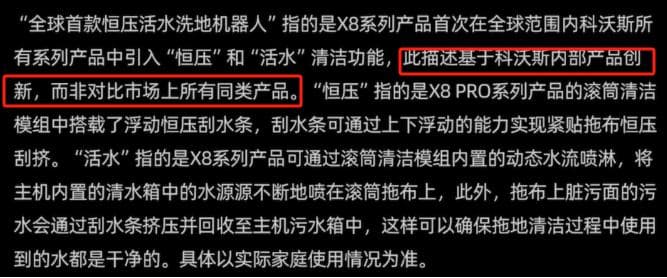杉川机器人CEO吴泽晓在接受媒体采访时称,双方路径相似,即通过搭载浮动恒压刮水条、动态水流喷淋、刮水条挤压污水回收的方式进行清洁。这意味着3i运用恒压活水技术早于科沃斯,X8Pro Plus宣传时能使用科沃斯首款,但并非全球首款。且相关宣传在详情页最后才做出说明,一般普通用户很难看到。同时,科沃斯品牌在微博、小红书等平台宣传这款产品时并未带有以上说明,这很容易误导消费者。