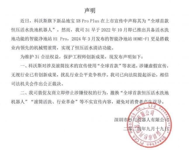 杉川机器人方面认为科沃斯方面存在虚假宣传,但科沃斯相关负责人在接受媒体采访时表示,旗下品牌添可2022年已获得活水技术专利 CN114983290B、恒压专利 CN217524978U,并将起诉杉川机器人,以保护科沃斯专利权和其他合法权益。