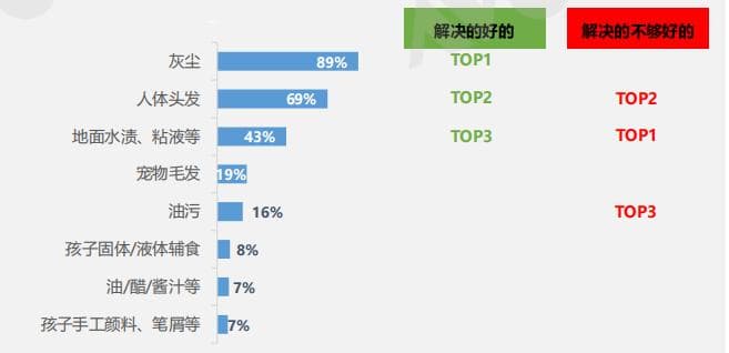 一是扫地机器人刚需属性并不突出,消费者介于可用可不用,可买可不买之间。这种抉择下,让消费者对扫地机器人愈发理性和实用主义至上。但遗憾的是行业虽一直在卷技术创新,但消费者最为关注的清洁问题仍未得到很好解决。《2024中国清洁电器产业与消费者洞察白皮书》指出,消费者使用扫地机主要用来清洁灰尘、人体头发及水渍/黏液等污渍,但他们认为扫地机也应继续加强对水渍/黏液、人体头发及油污的清洁效果。