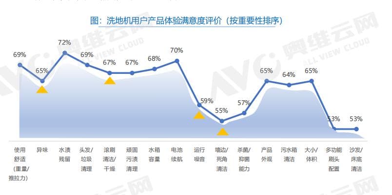 同样的问题也出现在众多扫地机器人厂商推出的洗地机产品上,如洗地机在墙边/死角的清洁力度明显有所欠佳,用户评价满意度偏低。此外,洗地机产品普遍配置多功能刷头,但消费者却认为重要性不高,满意度偏低。