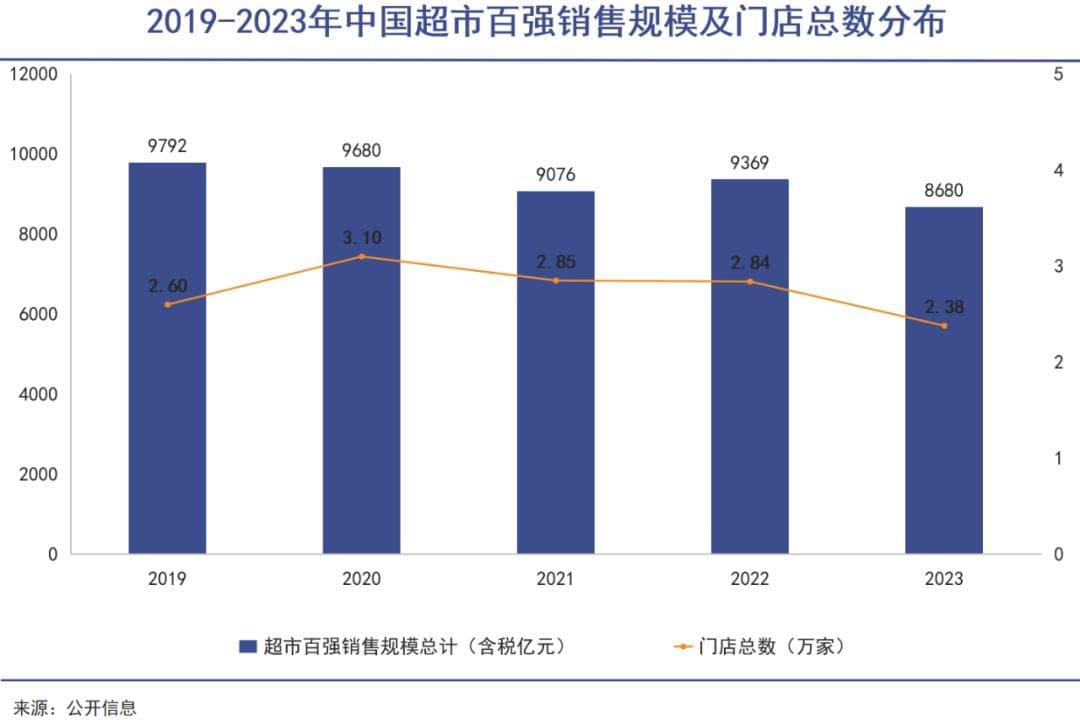 过去五年,超市百强销售规模连续下滑。2023年为8680亿元,仅有2019年的88%;门店数量在2020年达到3.1万家的峰值后,到2023年跌至2.38万家,减少近四分之一。