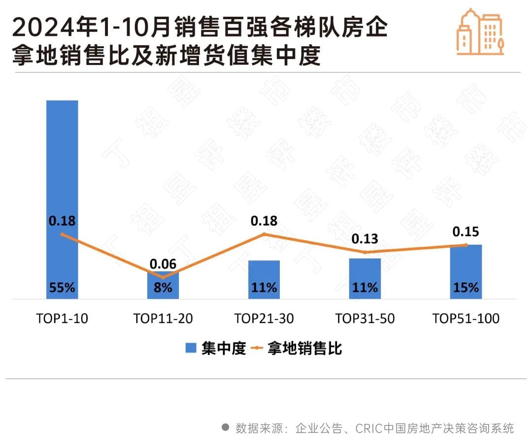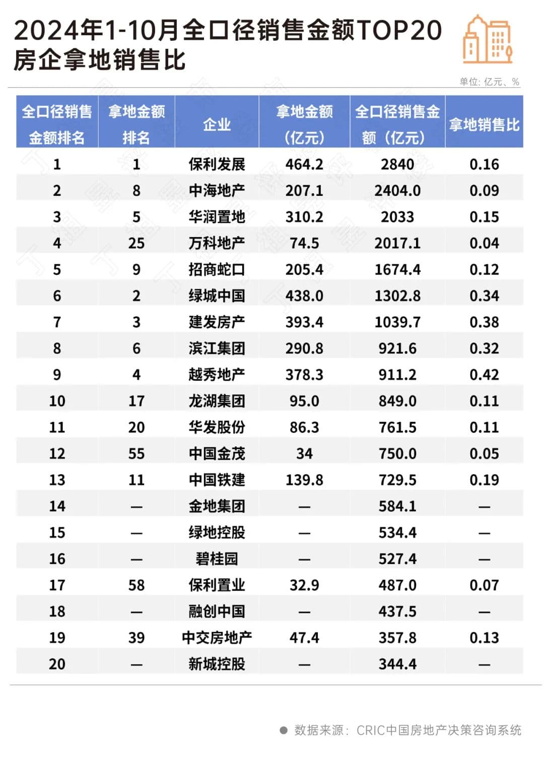 2024年1-10月,百强房企销售操盘金额同比下降32.7%的情况下,房企新增土储降幅延续。