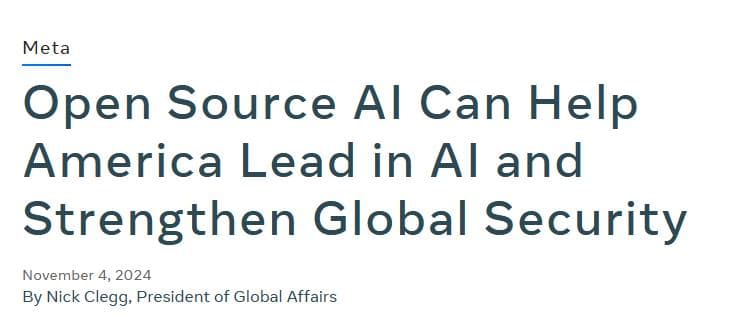 “Meta希望为美国及其最亲密盟友的安全、安保和经济繁荣尽一份力,”Clegg称,“广泛采用美国开源人工智能模型既符合经济利益,也符合安全利益。”