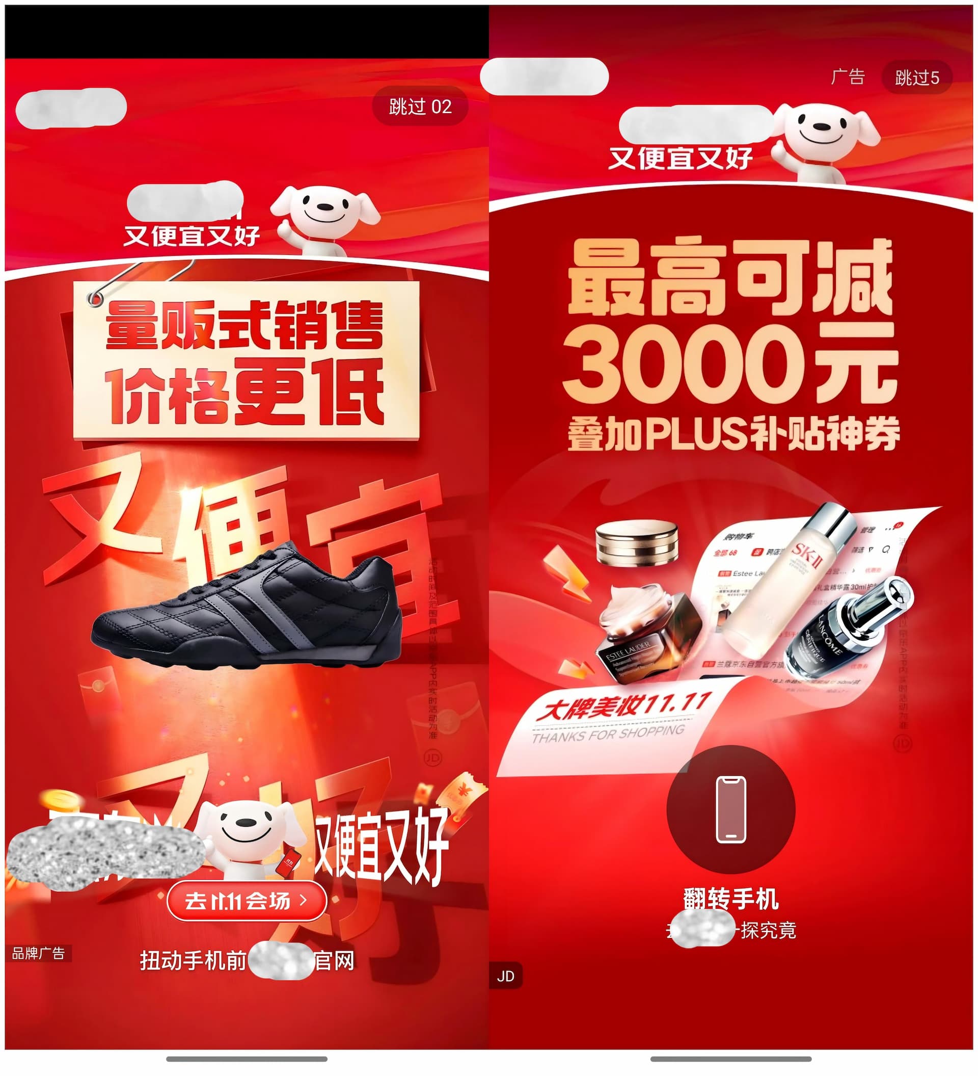 面对群情激奋的网友,2021年工信部约谈了多家互联网头部企业。被约谈后,互联网企业稍微消停了几天,但很快卷土重来。以开屏广告为例,今天小雷随手打开了两款常用App,结果都出现了双11的营销广告,而且虽然没有了“摇一摇”,但“翻转手机”和“扭动手机”跳转又来了。