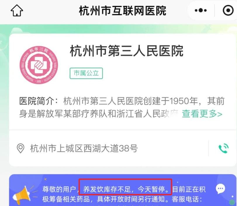由于年轻人太热情,杭州市三院紧急公众号首页挂出通知,“养发饮库存不足,今天暂停”。