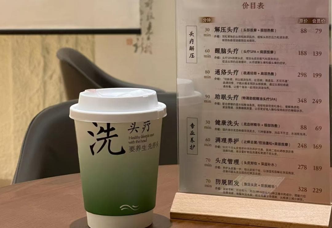 有养发馆就打出,“头疗一次相当于8小时深度睡眠”;还有沉浸式按摩“激活第三眼轮”;中医+洗头相结合,边喝茶边洗头。
