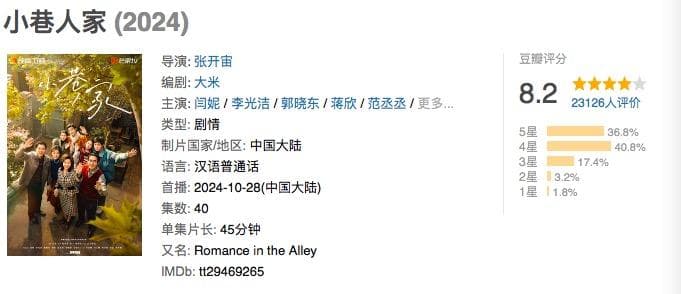 在两部古偶热火朝天的对抗赛里,剧集市场也出现了另一赢家:《小巷人家》。作为正午阳光新作,该剧最新豆瓣开分8.2分,成为近期口碑代表;招商层面,该剧开局10广,合作品牌超18个;甚至在“摇人式”剧宣上,该剧也因为调动了正午的头部剧矩阵、芒果的爆款矩阵,而收获了一波高热话题。